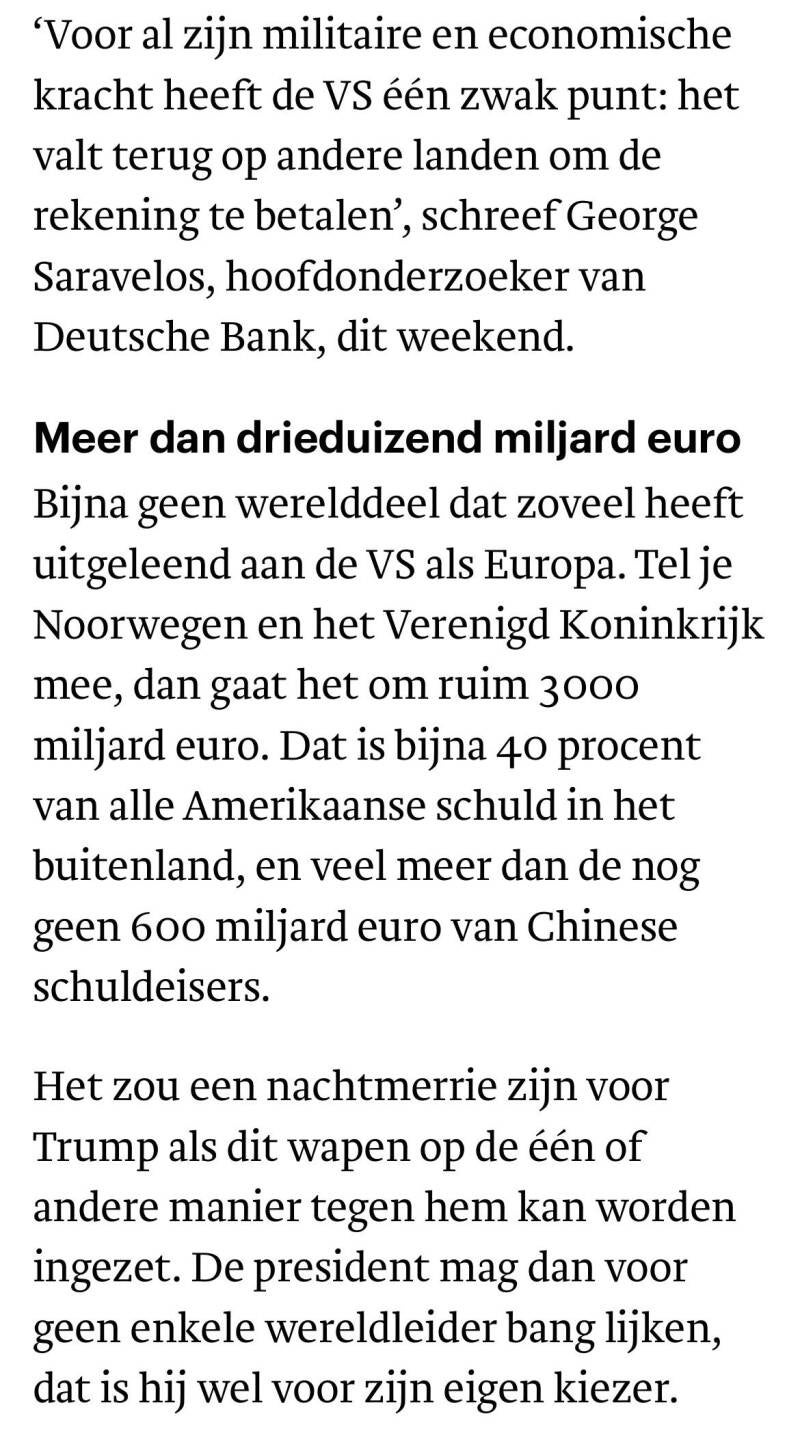 Gebruik ons ijzersterke anti-dwanginstrument! Als wij een potentiële €3000 miljard aan leningen aan USA terugtrekken, gaat Trump in no time jammerend op zijn rug liggen, 'genade, genade' roepend!